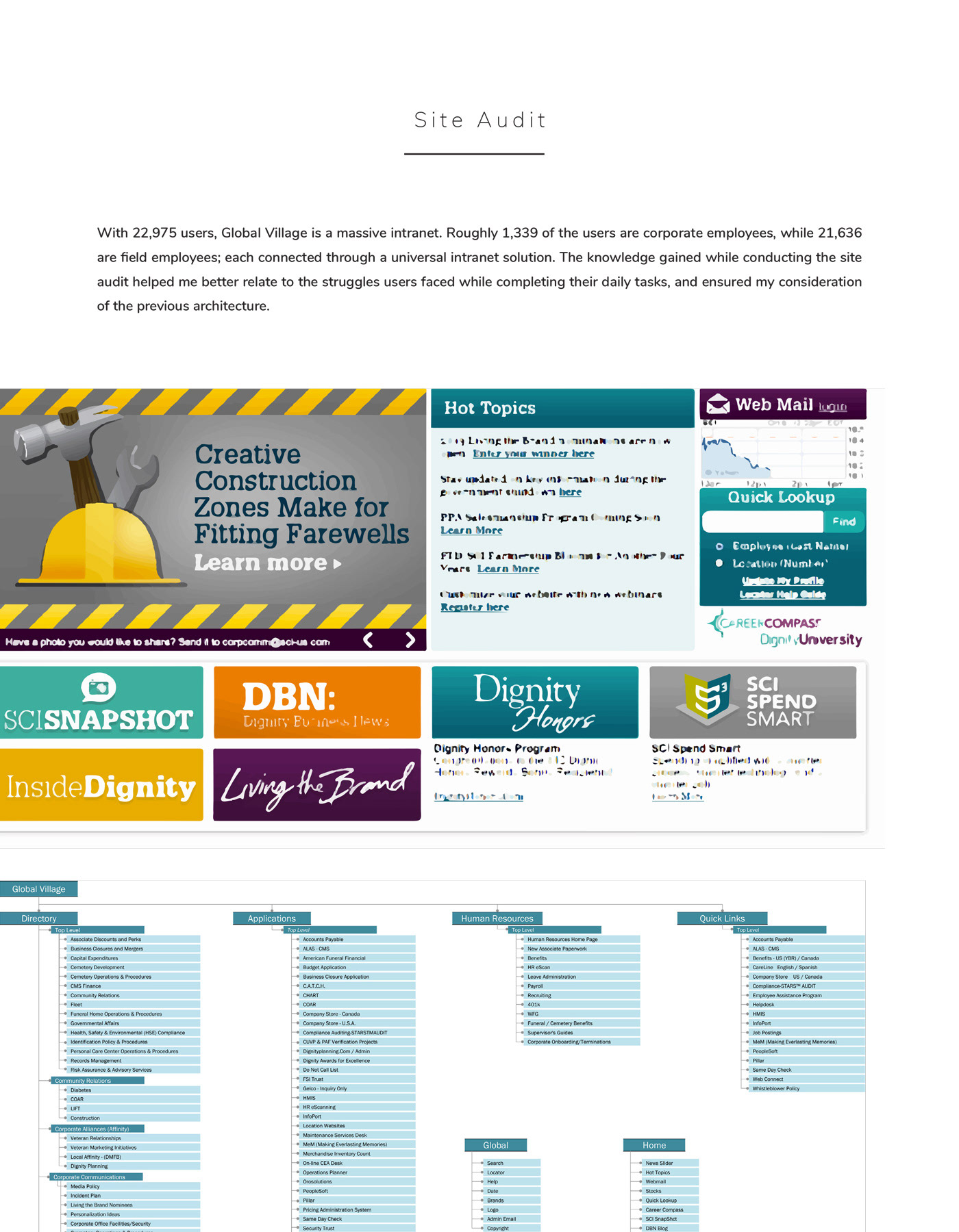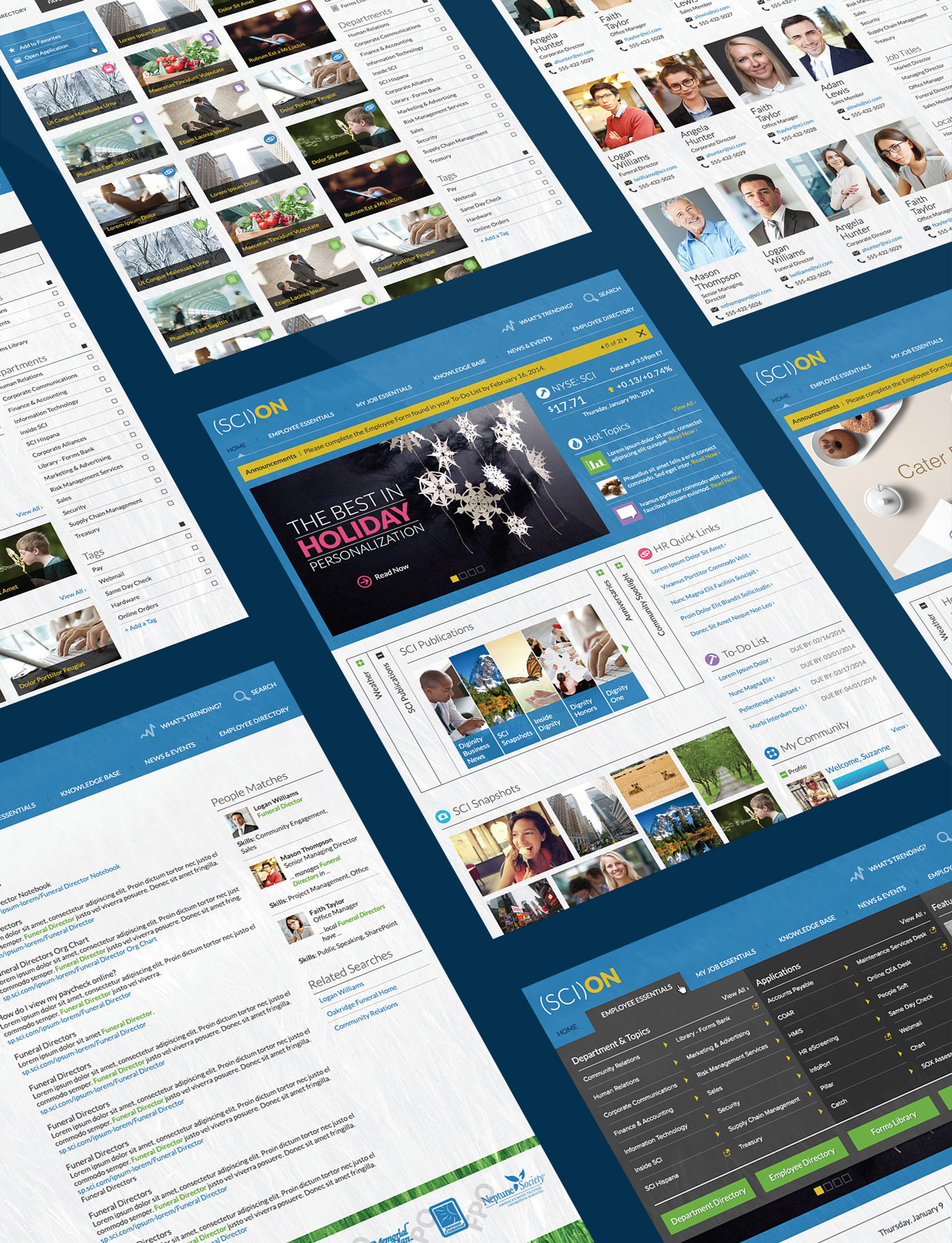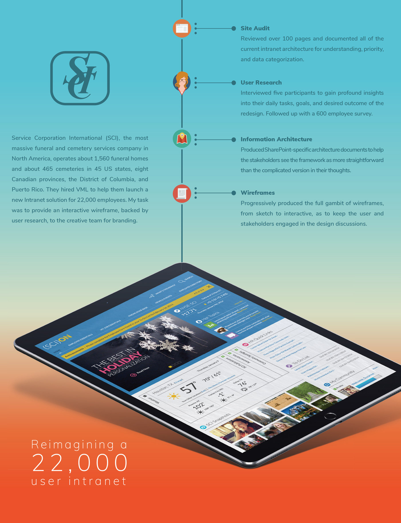 Service Corporation International (SCI), the most massive funeral and cemetery services company in North America, operates about 1,560 funeral homes and about 465 cemeteries in 45 US states, eight Canadian provinces, the District of Columbia, and Puerto Rico. They hired VML to help them launch a new Intranet solution for 22,000 employees. My task was to provide an interactive wireframe, backed by user research, to the creative team for branding.