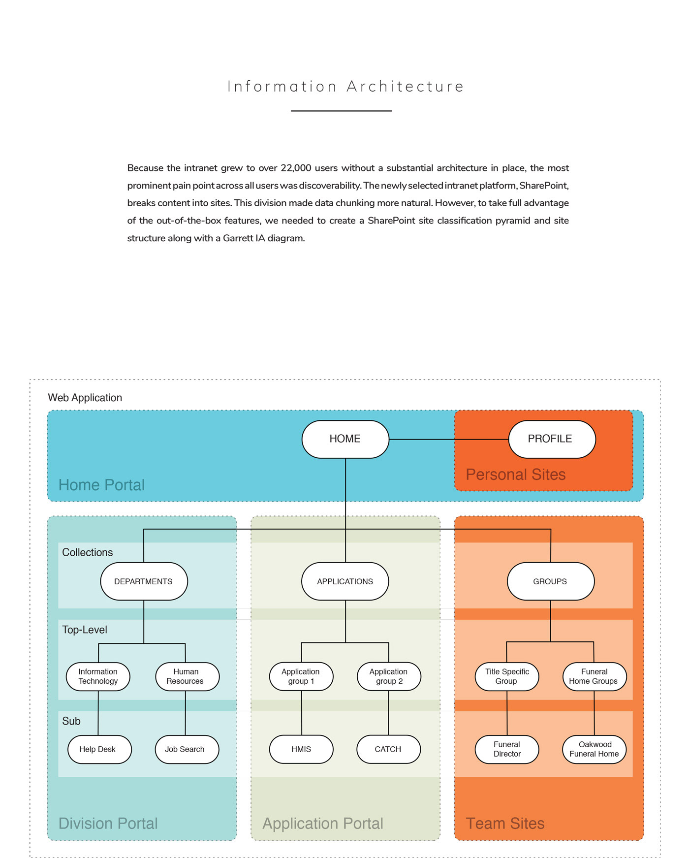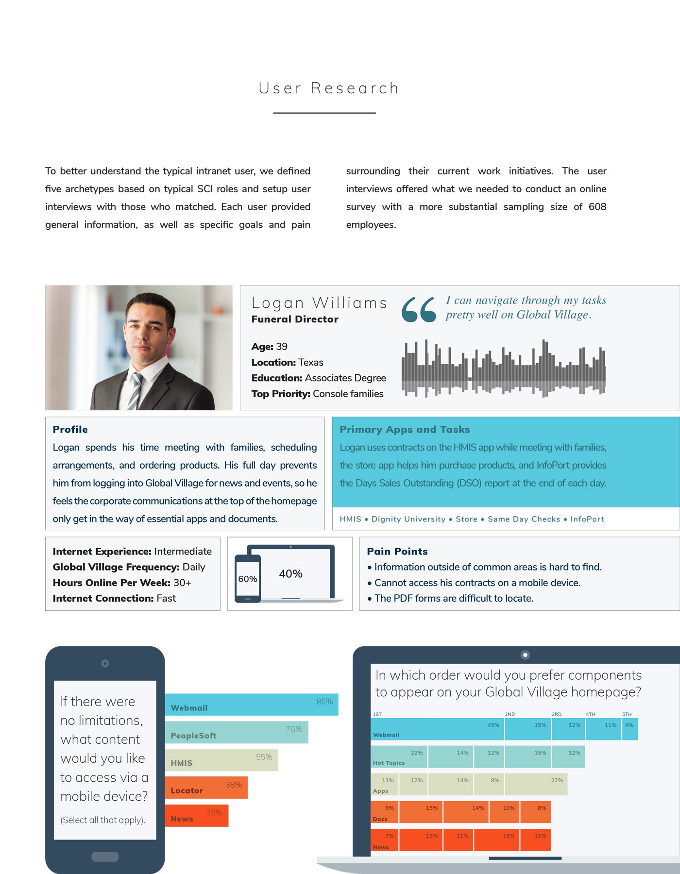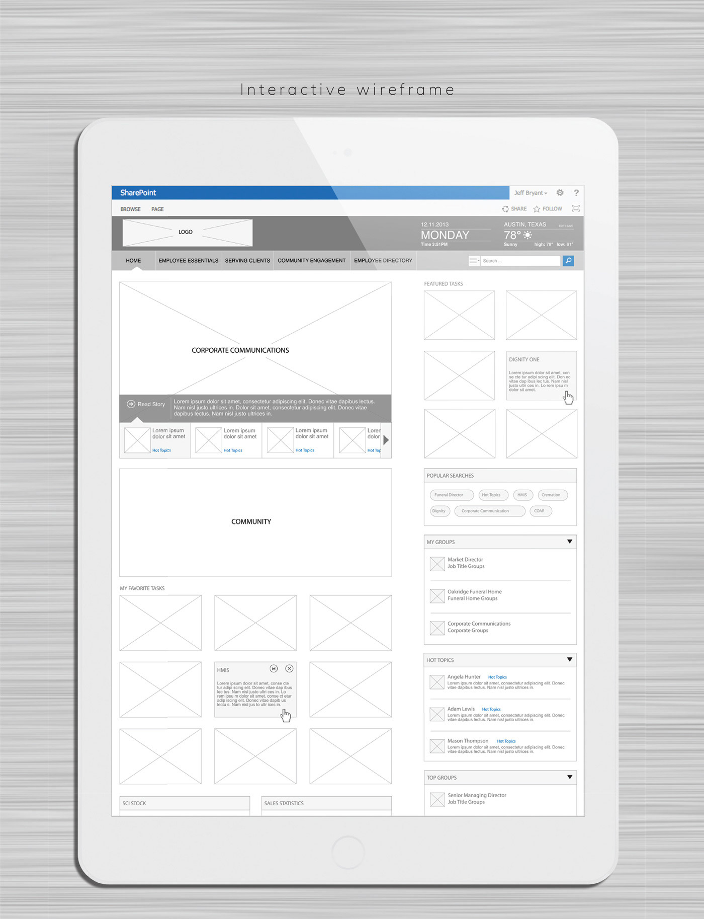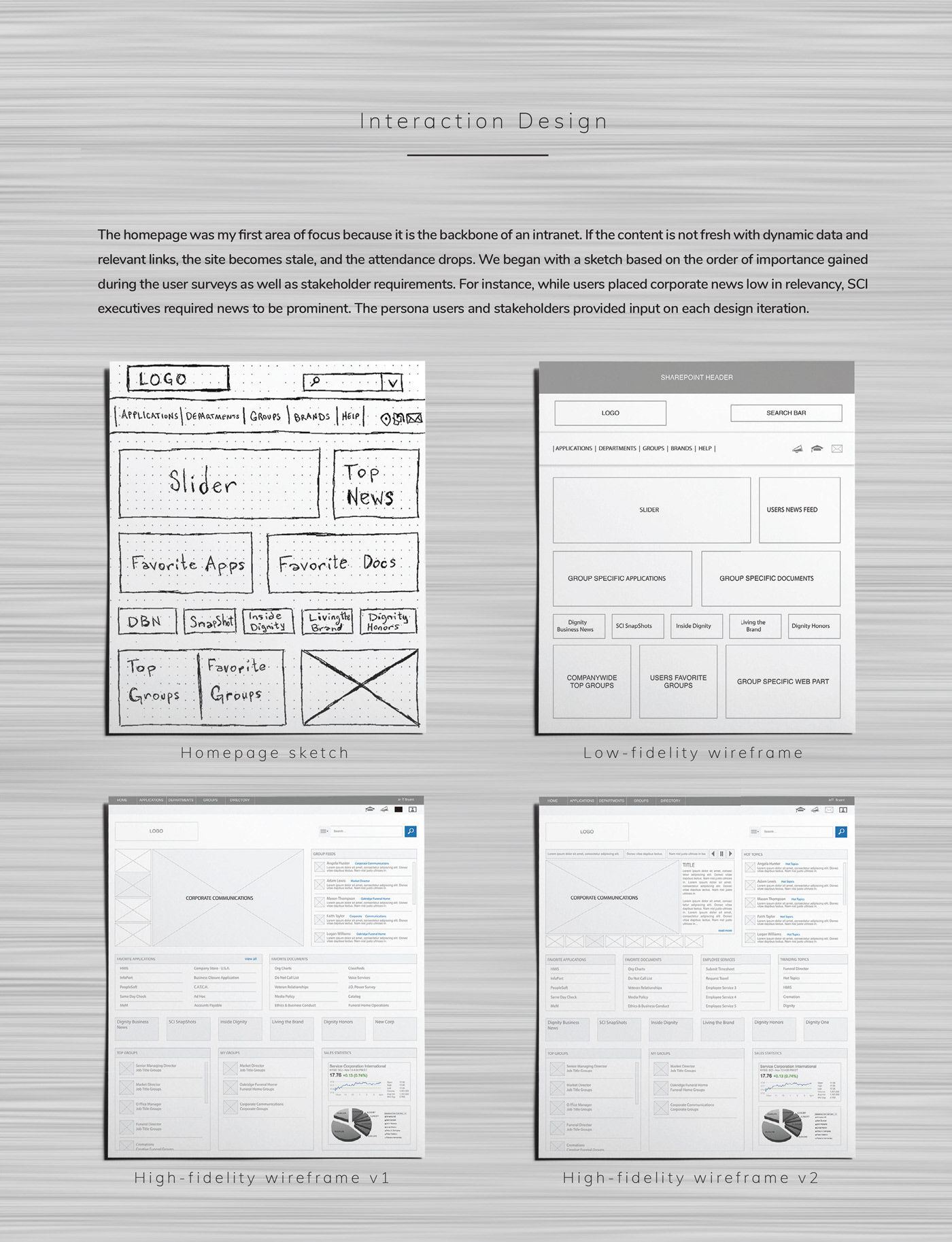 Service Corporation International (SCI), the most massive funeral and cemetery services company in North America, operates about 1,560 funeral homes and about 465 cemeteries in 45 US states, eight Canadian provinces, the District of Columbia, and Puerto Rico. They hired VML to help them launch a new Intranet solution for 22,000 employees. My task was to provide an interactive wireframe, backed by user research, to the creative team for branding.